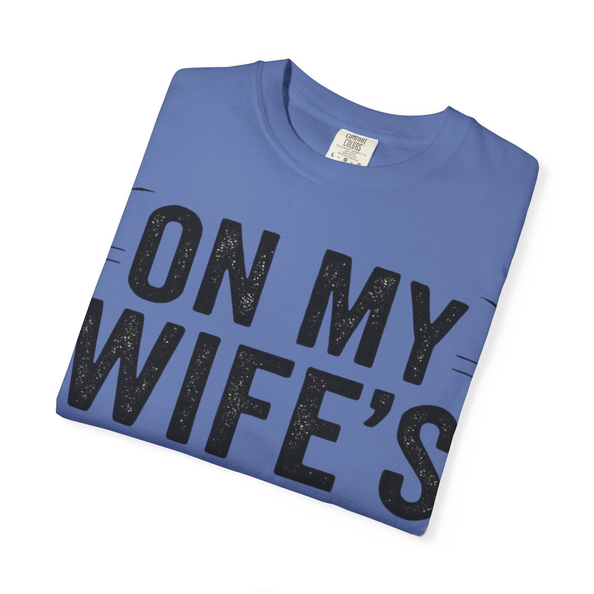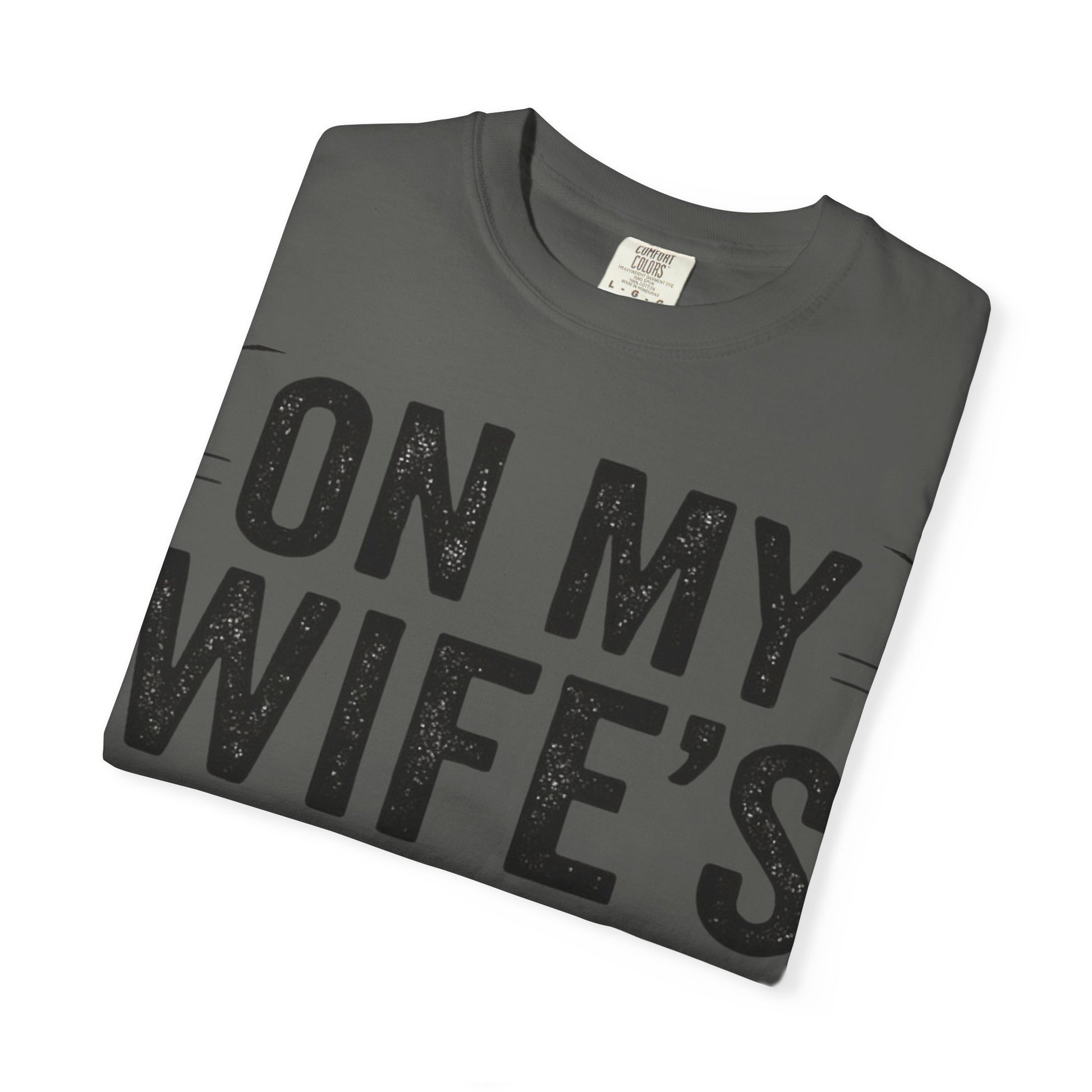 Introducing the ultimate conversation starter: the "On My Wife's Last Nerve" T-Shirt! Perfect for a husband's sense of humor , this shirt is crafted from soft, breathable fabric for all- day comfort. The bold, black lettering on a classic shirt ensures your witty message stands out. Ideal for casual outings, family gatherings, or just lounging around, this shirt adds a playful twist to your wardrobe. Get ready to bring smiles and laughs wherever you go with this cheeky and relatable tee. Grab yours today and embrace the humor in every relationship!